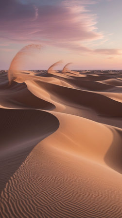 Expansive sand dunes feature windblown sand under a pastel sky creating a tranquil desert scene great for travel or nature content.