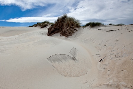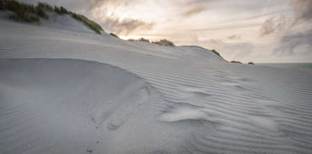 White sand dunes scenery shot during sunset on Wharariki Beach, New Zealand