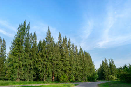Pine with road on blue sky background at evening in Military camp.