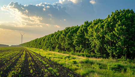 As the sun sets, casting long shadows across a freshly tilled field, a line of lush green trees stands guard.