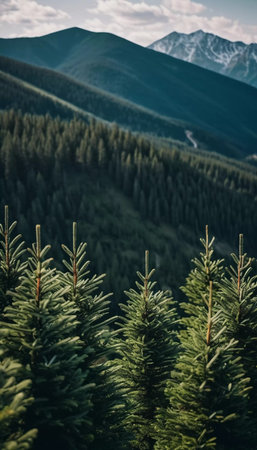 A serene landscape of dense evergreen trees in a forest with varying shades of green