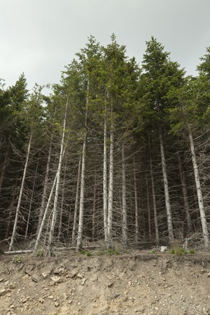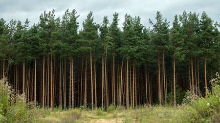 tall trunks of pine forest in cloudy weather, landscape