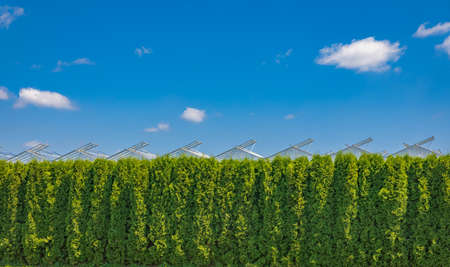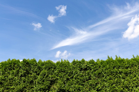 Green hedge and blue sky with clouds as a background