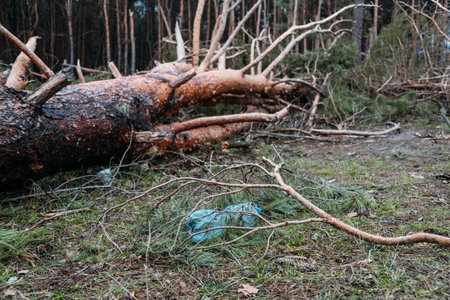 Environmental issues, problems. Plastic bottle in trunk of pine fallen tree. Windfall in pine forest. Storm damage. Fallen trees in coniferous forest after strong hurricane wind