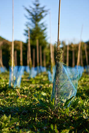 Plastic protective tree guards around newly planted saplings, Replantation of trees at a recently felled forestry site