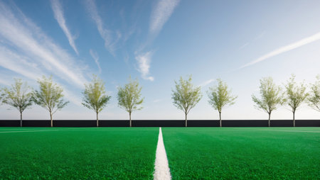 AI Generated. Green synthetic turf field with clear blue sky and trees in the background