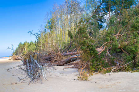 The storm at sea. Trees felled by the hurricane. Destruction of a pine forest