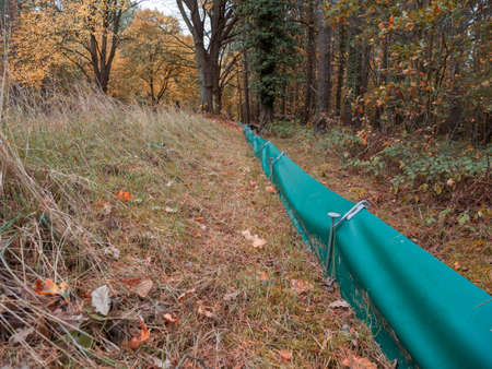 between a road and a forest there is a green fence to protect frogs and toads