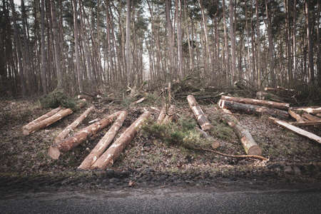 Tornado storm damage. Fallen pine trees in forest after storm. Uprooted trees fallen down in woodland due to wind storms