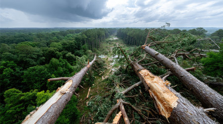 A serene forest landscape showcases fallen trees after a storm, under dark clouds. The scene captures nature's beauty and resilience, inviting reflection on ecological impacts.