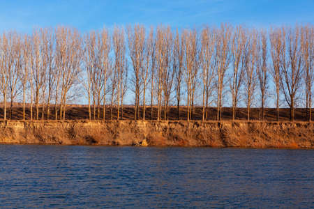 Riverside trees in a row . River bank in the springtime