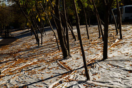 Autumn leaf and trees soil and grass lawn park