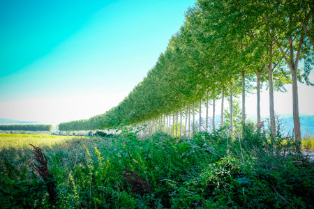 A scenic wide view of a long, straight row of tall poplar trees standing against a clear sky, with lush green fields in the foreground. High quality photo