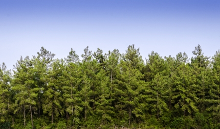 pines in deep forest and blue sky with clouds