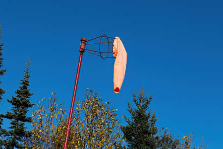 Windsock indicator of wind on runway airport. Wind cone indicating wind direction and force. Horizontally flying windsock (wind vane) with blue sky in the background.