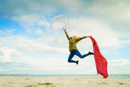 Happiness, enjoying weather, feeling great concept. Woman jumping with red scarf and transparent umbrella on beach near sea, sunny day, blue with clouds sky