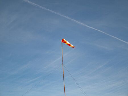 red and white windsock to indicate the direction of the air flow and the blue sky