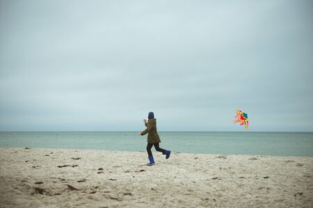 Young girl, wearing casual clothes, photographed on the beach in winter.
