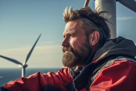 Engineer wearing a yellow raincoat is inspecting a wind turbine in a green field, contributing to clean energy and sustainable development