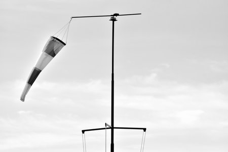 A red and white cone for measuring the strength and direction of the wind hangs motionless, calm