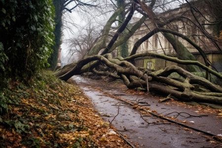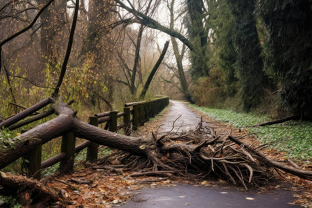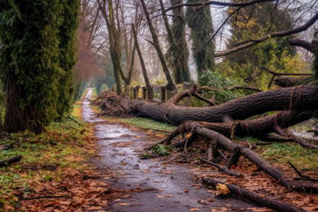 fallen tree branches scattered across a park pathway, created with generative ai