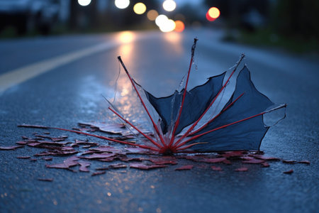 close-up of broken umbrella spokes and torn fabric on wet pavement, created with generative ai