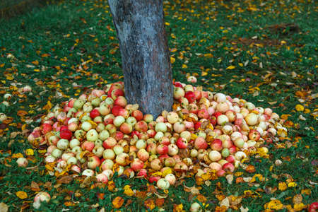 Ripe apples fell from the tree to the grass in the garden.