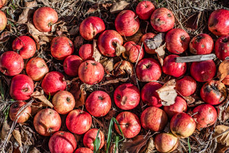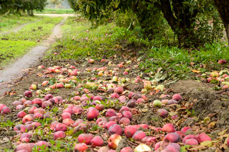 Rotten apples lie among the dry foliage under an apple tree. September