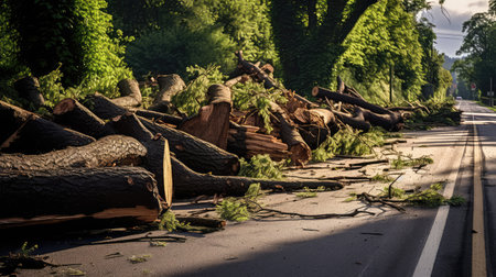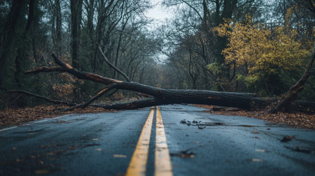 blocked road with caution tape around the fallen tree, created with generative ai