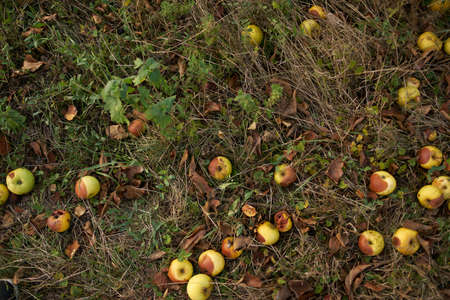 Ripe yellow apples on ground in orchard garden. Organic fallen dropped rotten fruits lying under apple trees on farm. Sunny summer autumn day in countryside. Eco natural background.