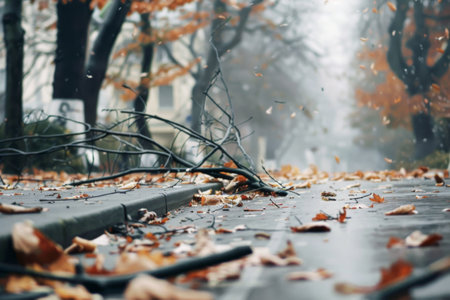 Freshly cut branches and leaves are scattered on wet asphalt during rain, creating an autumnal scene