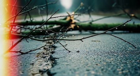 fallen tree on a rainy road with water flowing around it, created with generative ai
