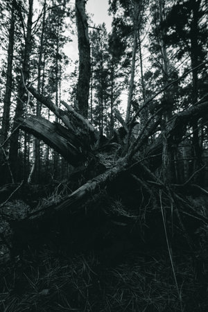 Fallen tree in a pine forest after a strong hurricane wind