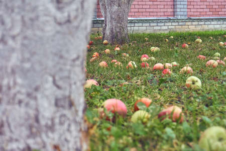 Red apples on the grass under apple tree. Autumn background - fallen red apples on the green grass ground in garden.