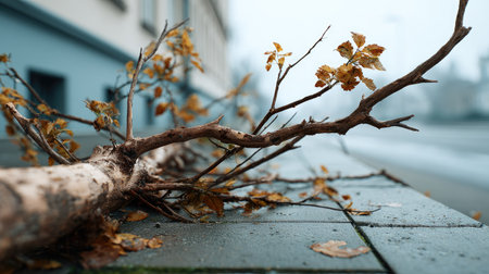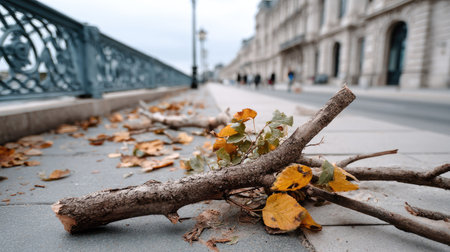 A close-up view of fallen branches and colorful autumn leaves scattered on a city sidewalk, capturing the essence of changing seasons in an urban environment.