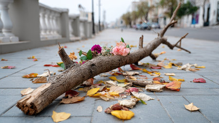 A rustic branch lies on a paved street, adorned with delicate flowers and surrounded by colorful dry leaves, capturing urban beauty in nature.