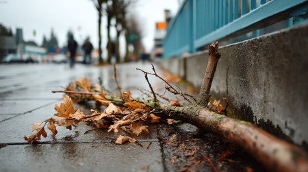 A close-up view of a fallen branch with dry leaves resting on wet pavement, capturing the essence of urban life during rainy weather and seasonal change.