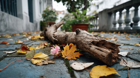 A picturesque scene featuring a fallen branch on a cobblestone pathway, surrounded by vibrant autumn leaves. This tranquil outdoor setting captures nature's beauty.