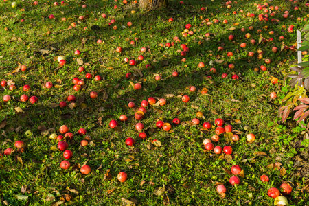 Apples fallen from the tree to the ground on the green grass in the mountain village