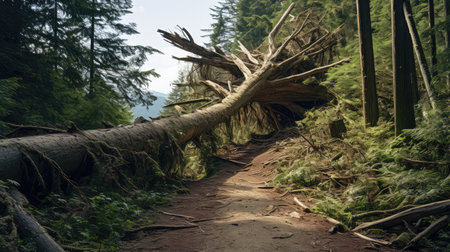 This image captures the aftermath of a storm, showcasing fallen trees strewn across the ground, highlighting the impact of natural disasters on landscapes.