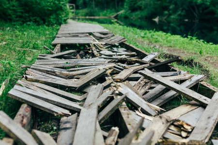 Old destroyed boardwalk in green forest. Nature wallpaper.