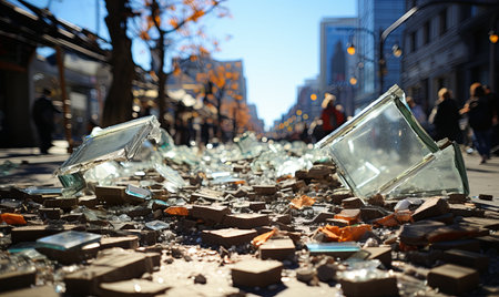 A collection of shattered glass scattered on the floor, reflecting light in a chaotic manner.