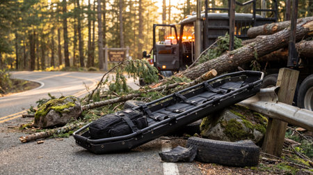 Emergency rescue stretcher beside fallen tree and debris blocking forest road with recovery vehicle and flashing lights in natural landscape.