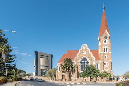 WINDHOEK, NAMIBIA - JUNE 17, 2017: A street scene with the Christuskirche, an historic German Lutheran church and the Independence Memorial in Windhoek