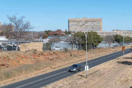 BLOEMFONTEIN, SOUTH AFRICA - JULY 4, 2019: The view across DF Malherbe Avenue towards the Universitas Academic Hospital and the medical faculty of the University of the Free State in Bloemfontein