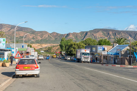 CALITZDORP, SOUTH AFRICA - APRIL 6, 2021: A street scene, with businesses, people and vehicles, in Calitzdorp in the Western Cape Karoo