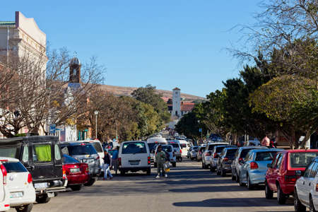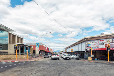 OUDTSHOORN, SOUTH AFRICA - APRIL 5, 2021: A street scene, with businesses, people and vehicles, in Oudtshoorn in the Western Cape Karoo.