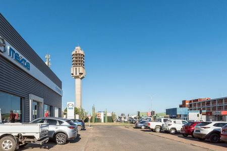 Kimberley, South Africa - Feb 24, 2023: A street scene, with vehicles and businesses visible, in Kimberley. The microwave telecommunications tower is visible