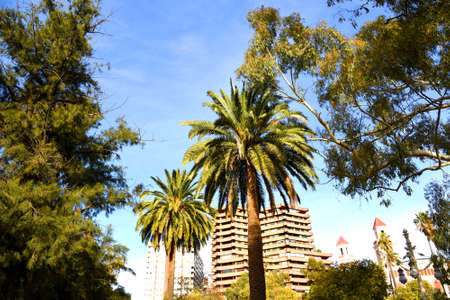 Palm tree and pine in city park. Date Palm (Phoenix dactylifera) of palm family (Arecaceae). Phoenix Palm or Dactylifera tree. Palmae near residential buildings. Palms on blue sky background.