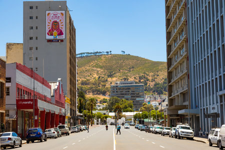 Cape Town, South Africa - December 7, 2022: Street view of city buildings with Table Mountain in background